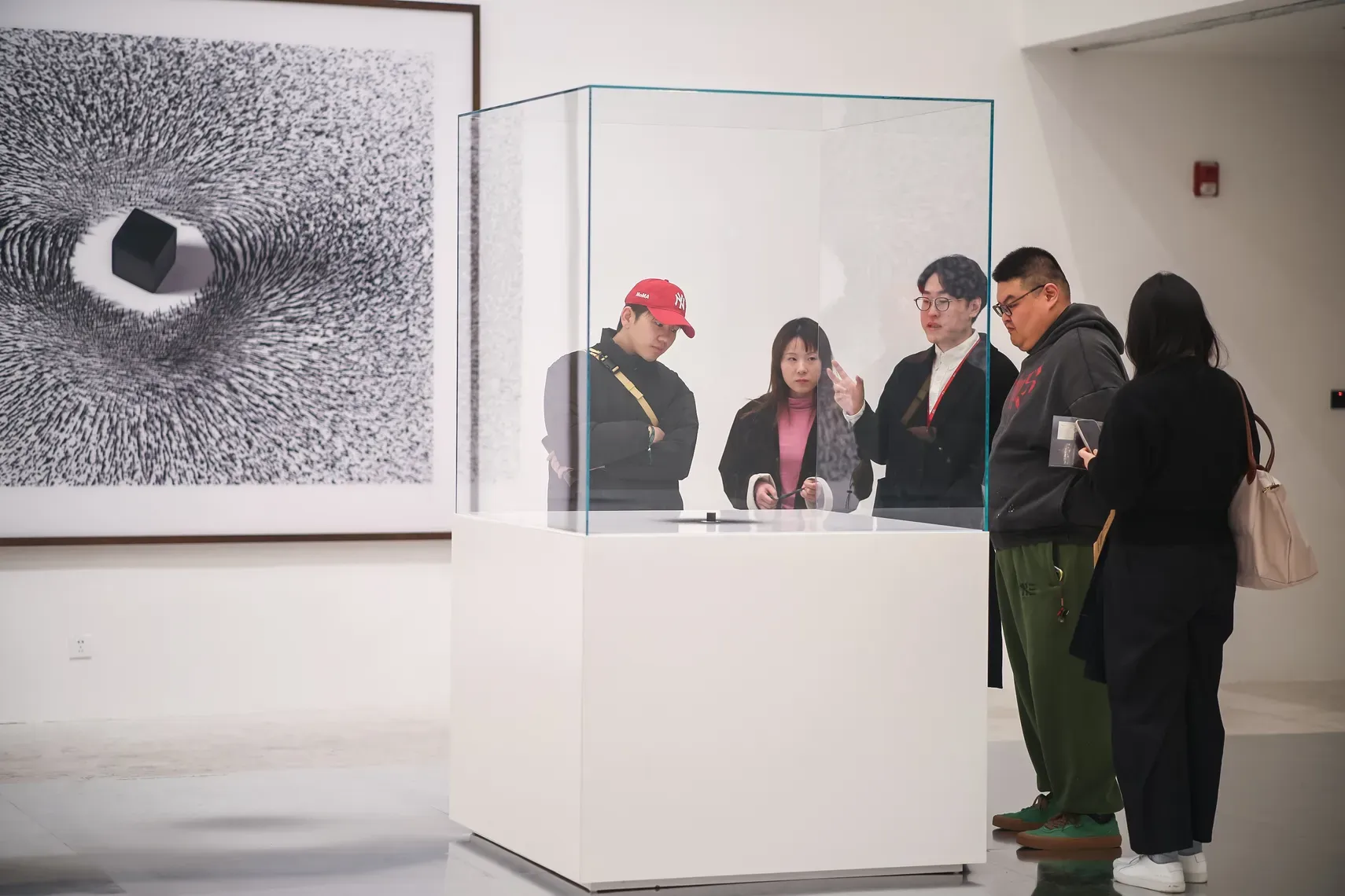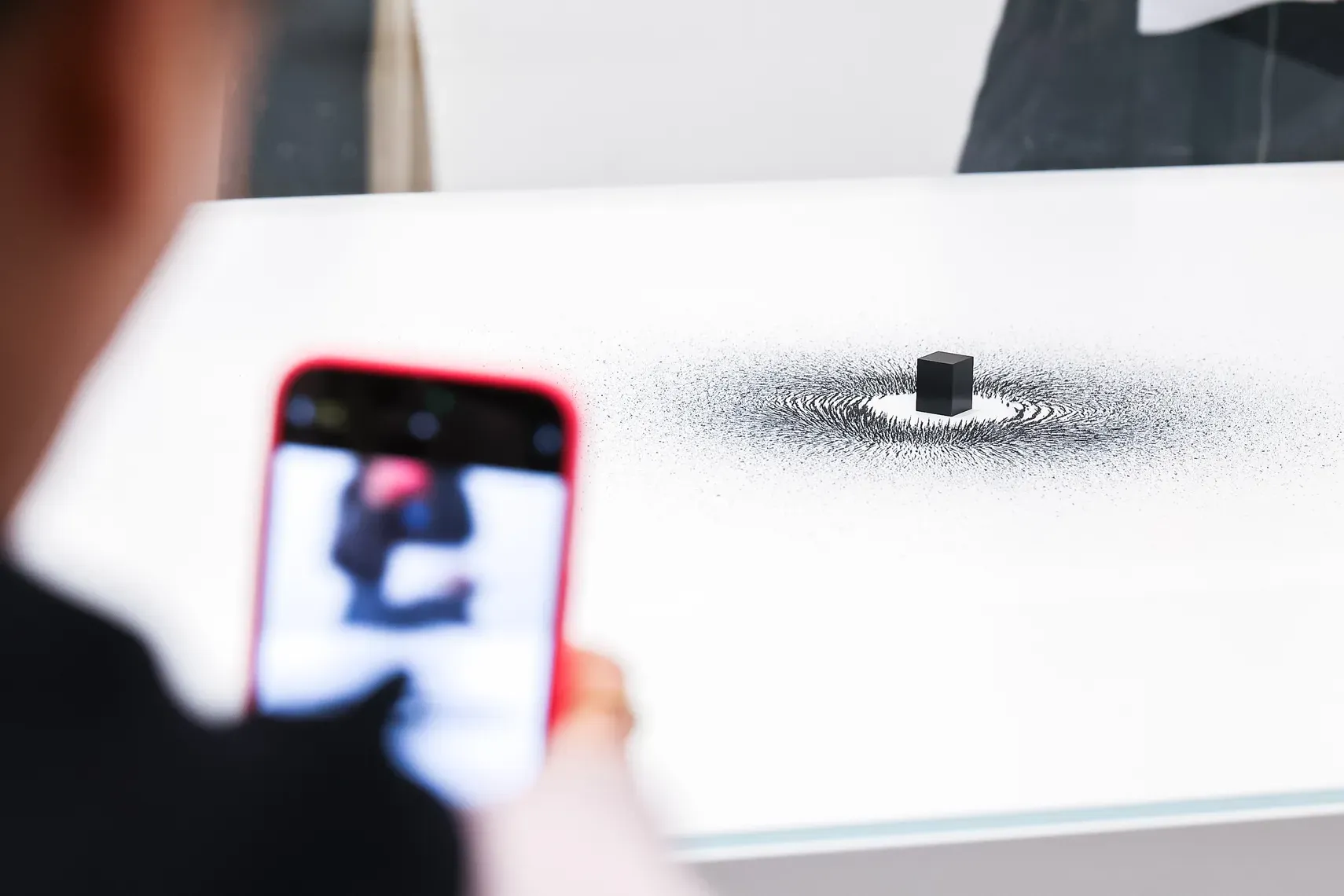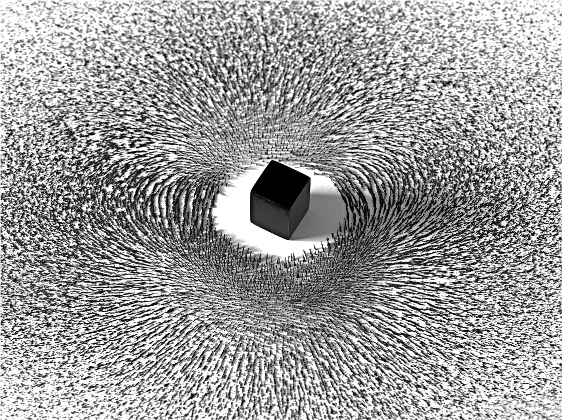 Among Mater’s most celebrated works, Magnetism remains one of the clearest examples of his conceptual elegance. A black cube placed at the center of a field of iron filings immediately recalls the Kaaba and the movement of pilgrims around it. Yet the work avoids literal illustration. Instead, it evokes attraction, orbit, devotion, and spiritual force through pure visual economy.
