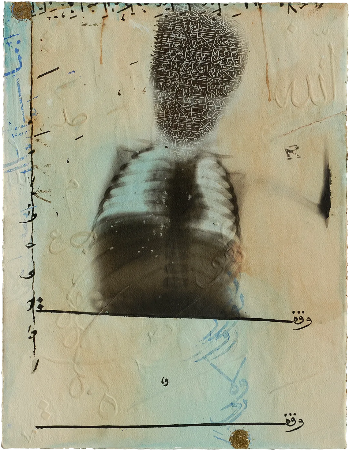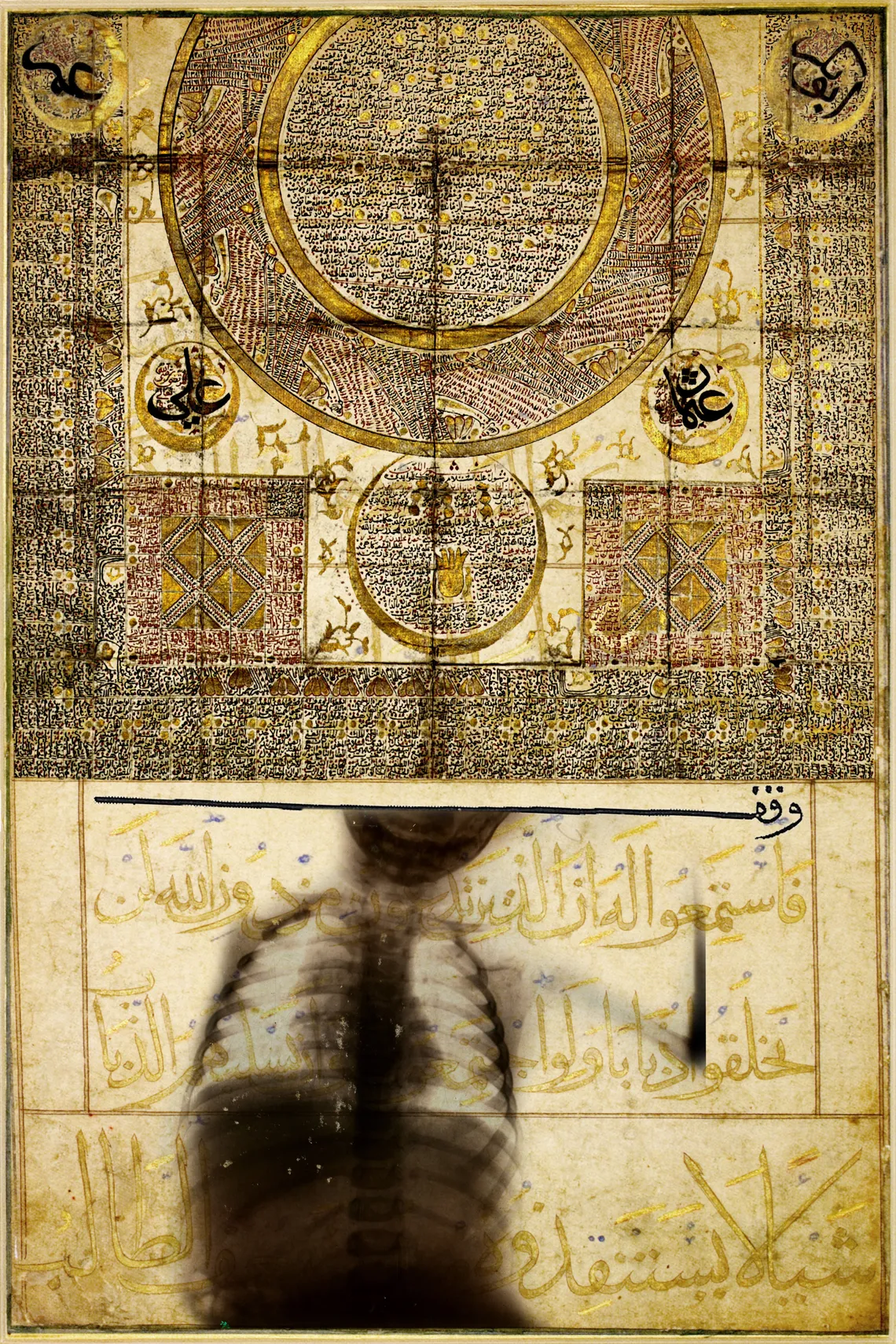 One of Mater’s defining early bodies of work, Illuminations, announced the terms of his visual language with unusual clarity. Using X ray imagery alongside Islamic forms and calligraphic references, he brought science and spirituality into direct conversation. Bones, organs, and inner structures became sites of reflection rather than medical fact. The body was no longer merely anatomical. It became symbolic, sacred, and open to interpretation.
