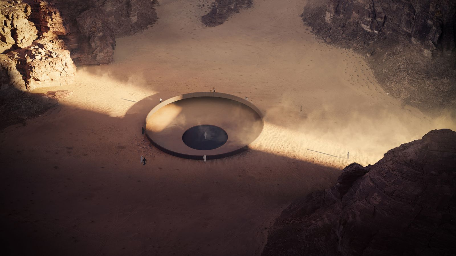 In recent years, Mater’s work has expanded in scale, reaching from image and installation into the landscape itself. Ashab Al-Lal, developed for Wadi AlFann in AlUla, marks a major evolution in his practice. Conceived as a monumental land art project shaped by mirage, perception, and scientific inquiry, it transforms the desert into a site of philosophical encounter.