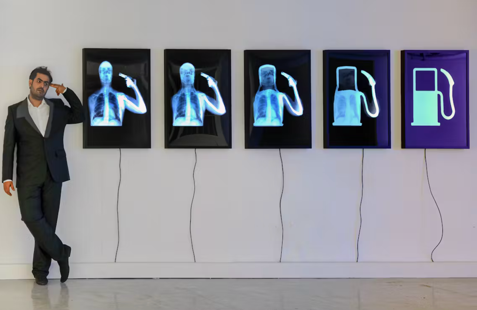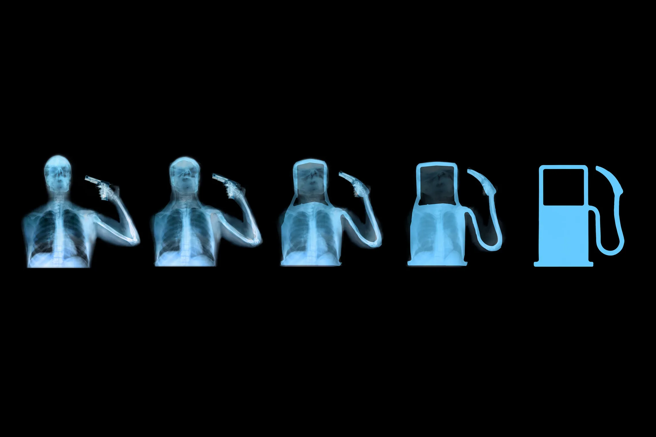 If Illuminations introduced Mater’s fusion of medicine and meaning, Evolution of Man sharpened that language into political critique. The work, showing a human X ray image morphing into a petrol pump, is among his most iconic statements. It is direct, unsettling, and unforgettable. In a single visual gesture, Mater connects the body to oil, industry to mortality, and modern progress to existential cost.