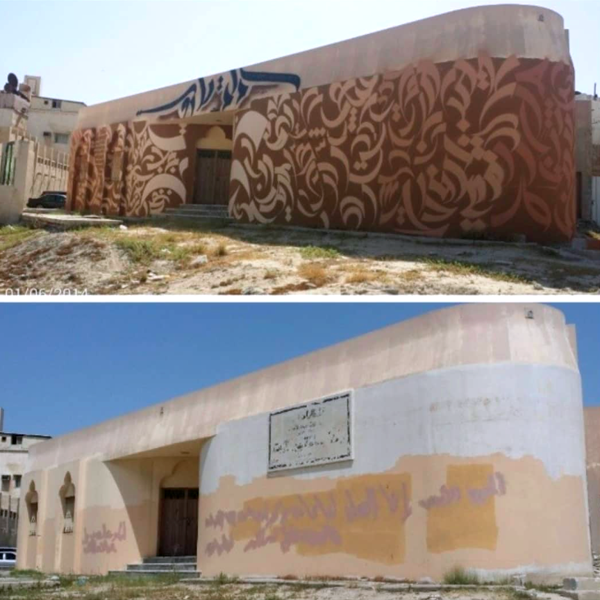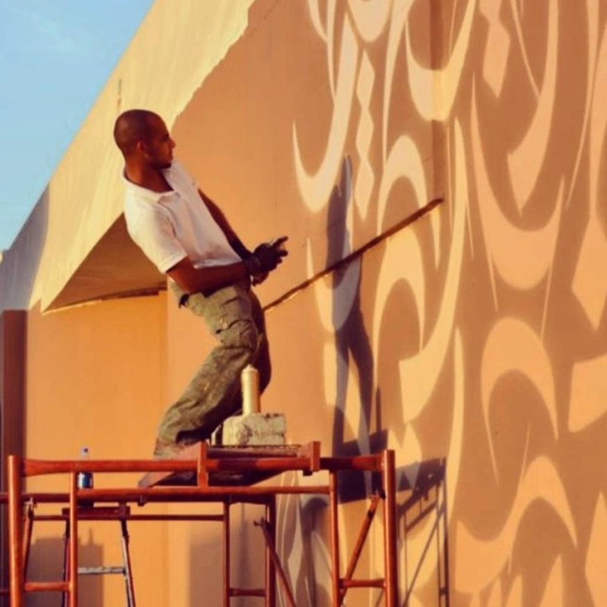 Before the gallery lighting and finished installations, there is Tarout Island, a small coastal island off Saudi Arabia’s Eastern Province near Qatif. Its close-knit communities and slower pace shape Alif’s approach to making through patience, restraint, and attention to process. His relationship with public space began there in 2014, when he completed one of his first major calligraffiti works on the walls of Hammam Tarout, translating the poem Al-Awda (The Return) by poet Adnan Al-Awami into large-scale Arabic calligraphy. Spanning more than 120 square meters and completed over ten days, the project treated the wall as a cultural surface carrying language, memory, and place.