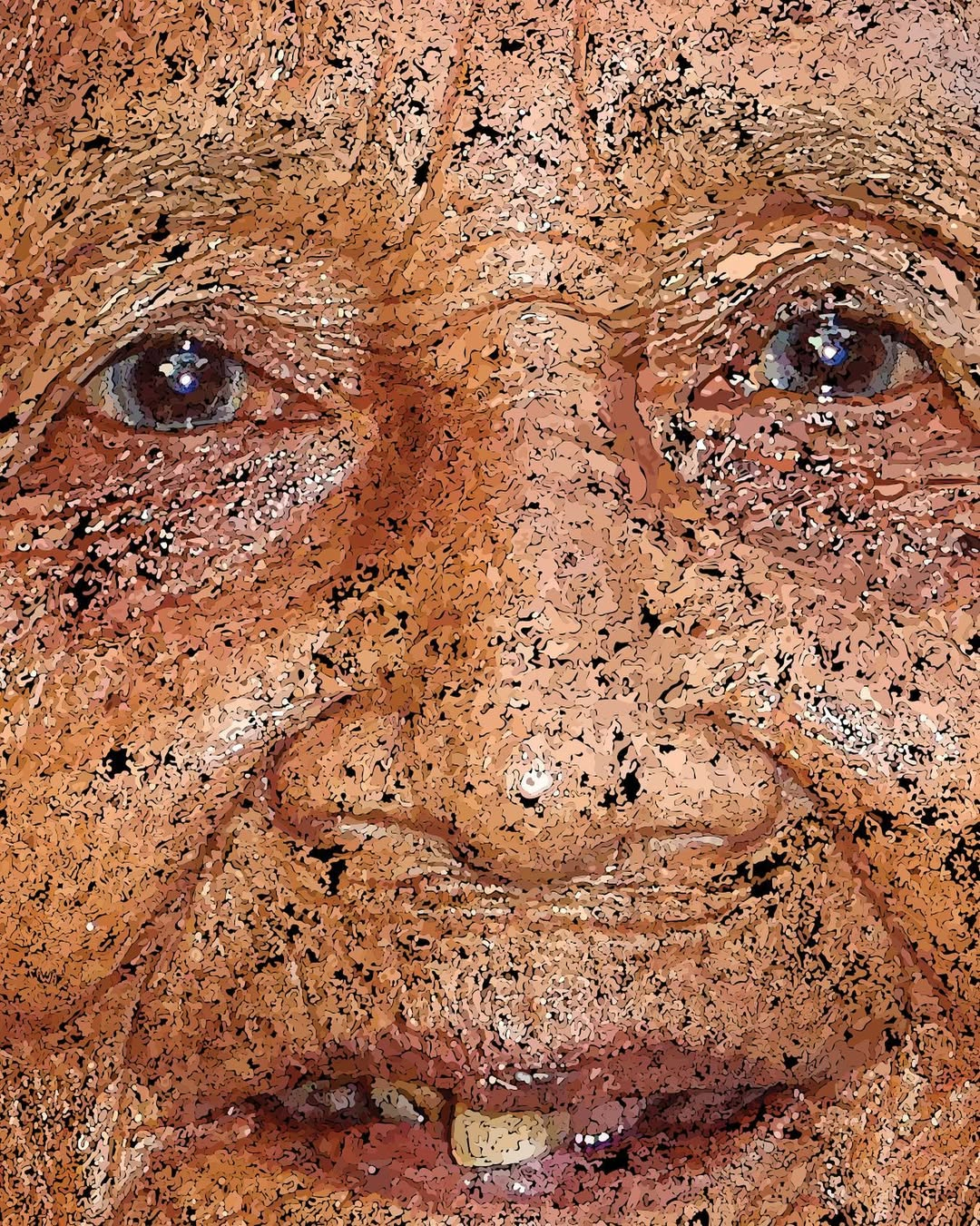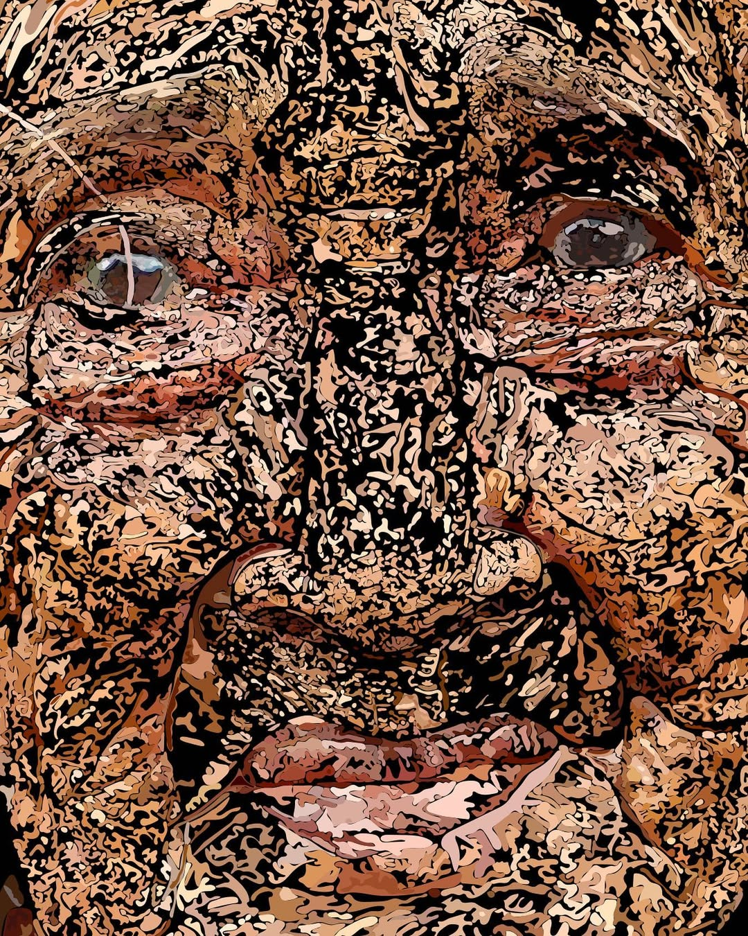A: I draw using software with an electronic pen and a pad. Each mark is deliberate, almost like stitching. It lets me sit with the face, stay present, and build respect into the portrait.