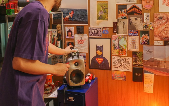 A door inside Huna AlHabib in Jeddah opens to a studio that feels like a city in miniature. Mini characters and model cars line the shelves; the walls are tiled with artworks gifted to him by friends and strangers. It is a living map of relationships, and the perfect setting for an artist who treats generosity as a method.