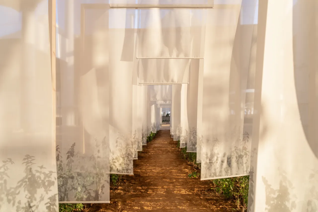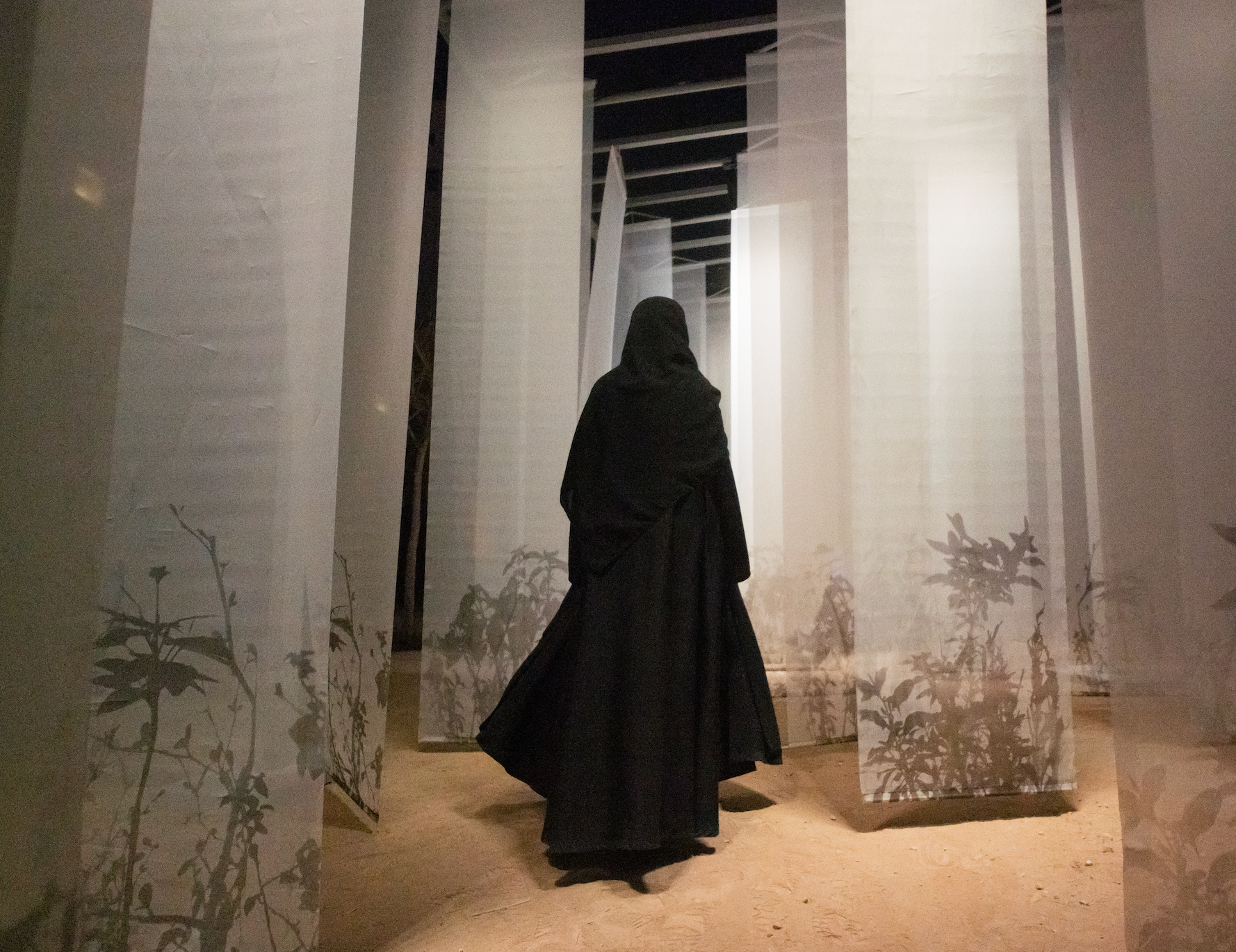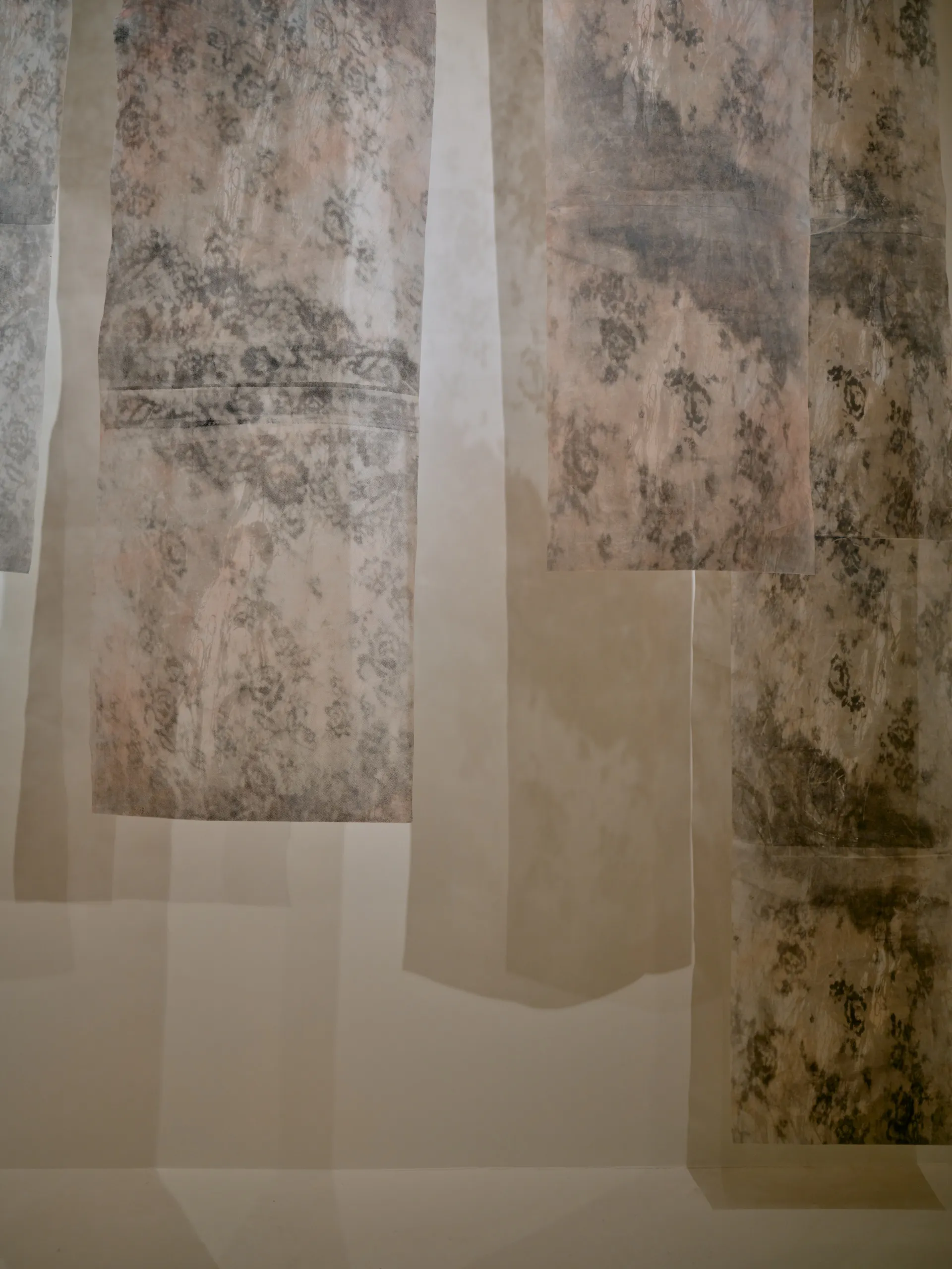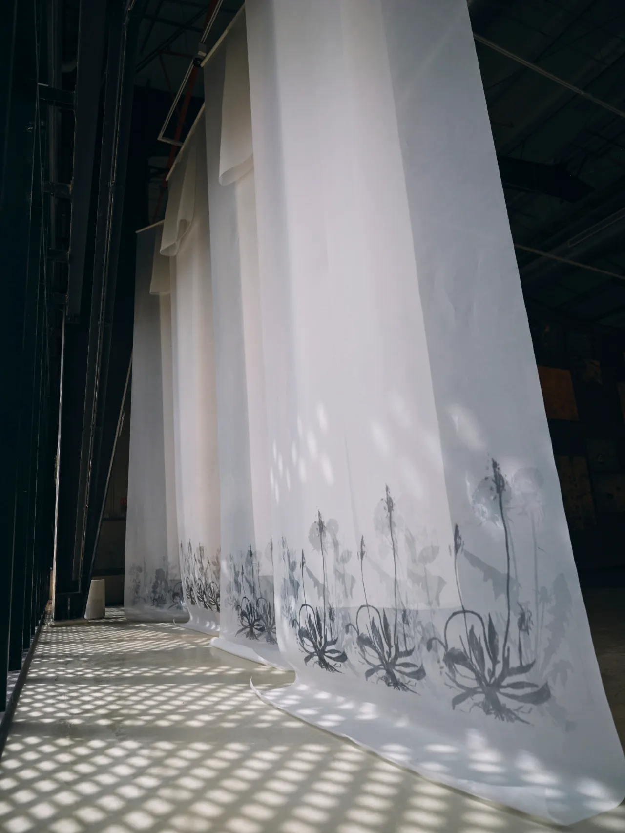 This installation unfolds like a quiet threshold, a shadowed garden you enter rather than observe. Translucent fabrics hang lightly in space, catching and releasing light as it moves, turning the room into a shifting field of silhouettes. Mesh becomes atmosphere. Shadow becomes image.