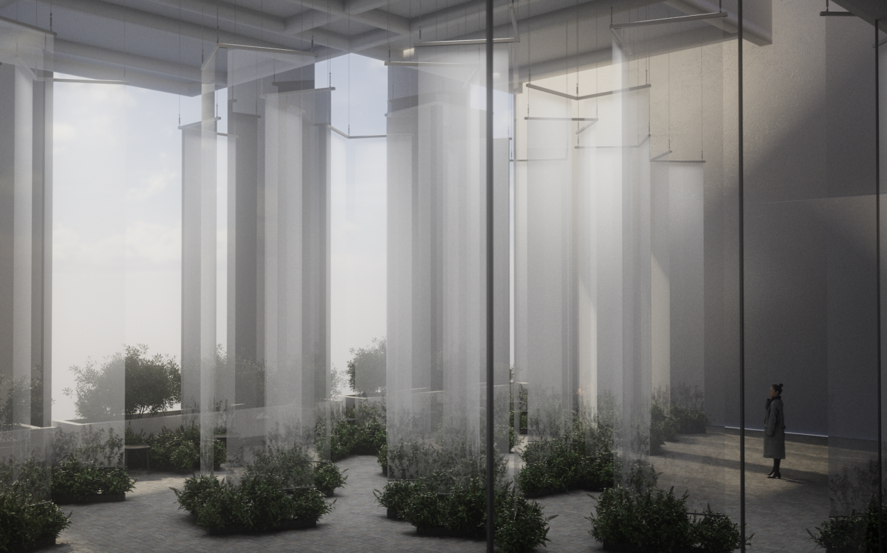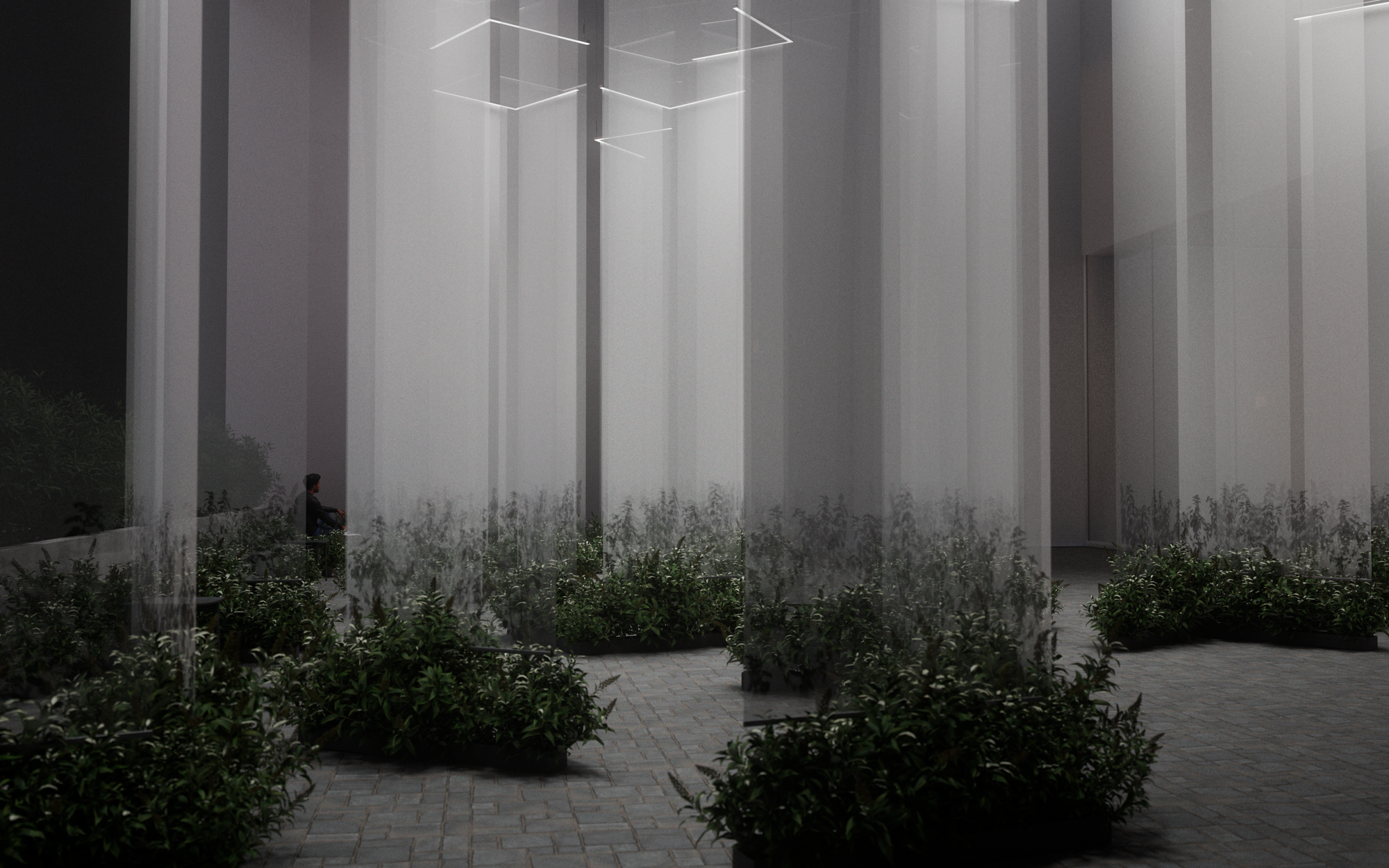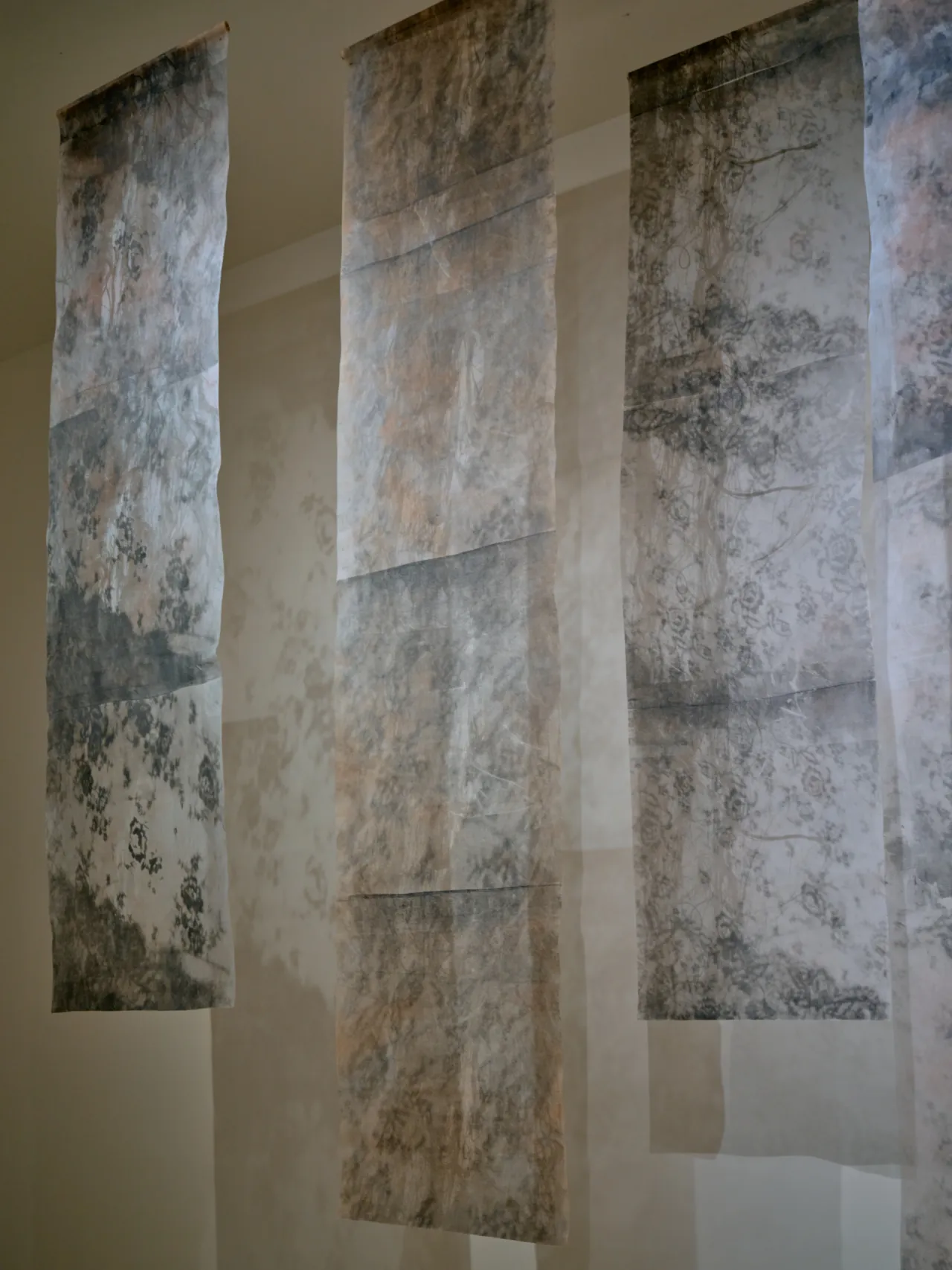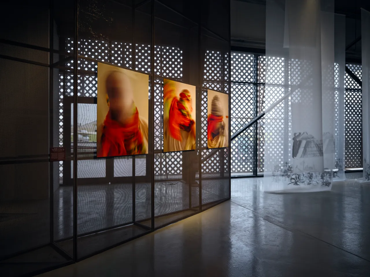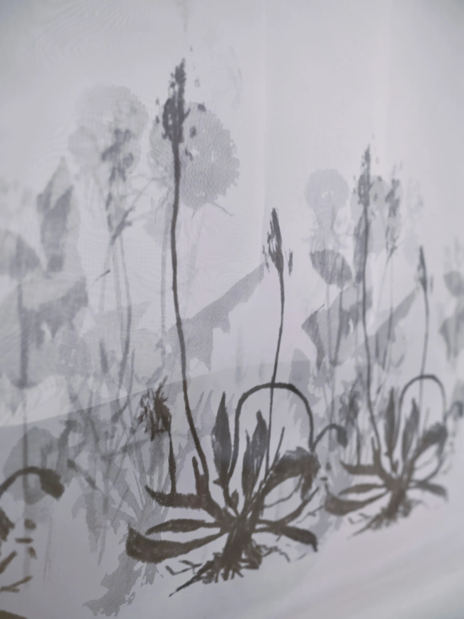 This installation unfolds like a quiet threshold, a shadowed garden you enter rather than observe. Translucent fabrics hang lightly in space, catching and releasing light as it moves, turning the room into a shifting field of silhouettes. Mesh becomes atmosphere. Shadow becomes image.