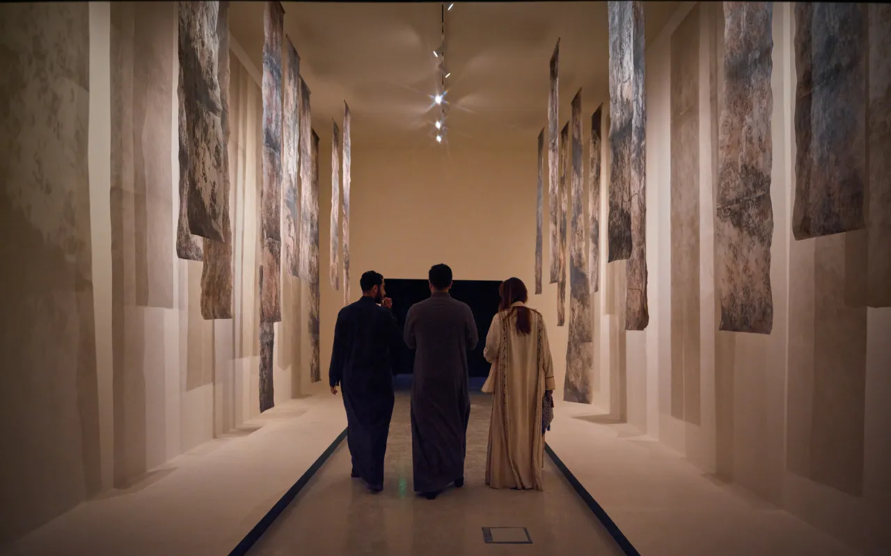 In سَيُشفىَ | It Will Heal, commissioned by the Saudi Arabia Museum of Contemporary Art (SAMOCA), Fatma Abdulhadi transforms inherited knowledge into spatial form. Inspired by an old remedy book and the familiar reassurance “it will heal you, inshallah,” the installation unfolds through suspended layers of charcoal drawings and silkscreen on mesh, creating a shifting environment that feels both intimate and expansive.