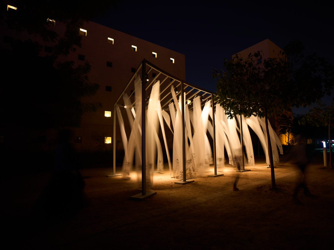 A single moving light guides the experience, asking the viewer to follow illumination as it drifts across surfaces. Shadows multiply gently: the fabric’s outline, the body’s trace, the slow passing of time itself. Installed within the stillness of the King Abdulaziz Historical Center for Noor Al Riyadh 2025, the work offers a space for pause and inward attention. It holds healing and growth in suspension, allowing reflection to gather softly before dissolving again into light.