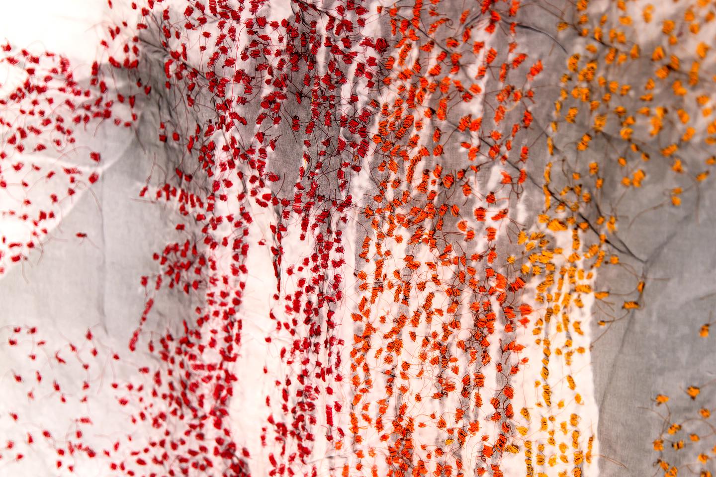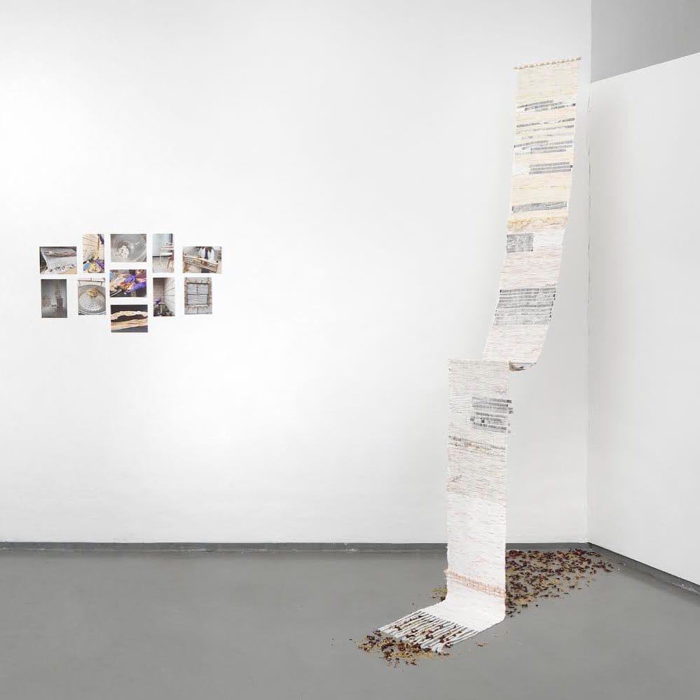 Weaving, 100% cotton threads, Naturally hand dyed 100% organic cotton, Naturally hand dyed 100% silk, Embroidered silk with 100% cotton threads, and printed negatives on film (Found imagery from Kurdistan, Syria, Turkey, and Saudi).