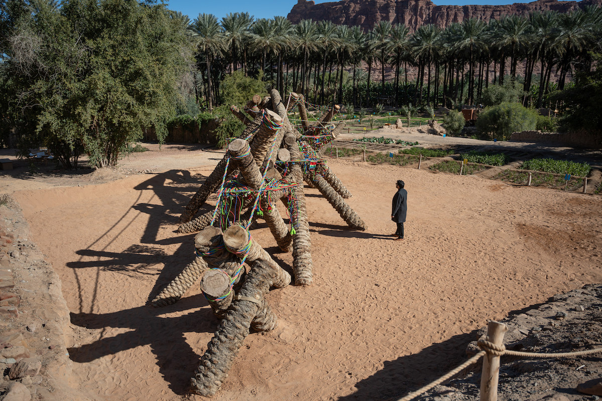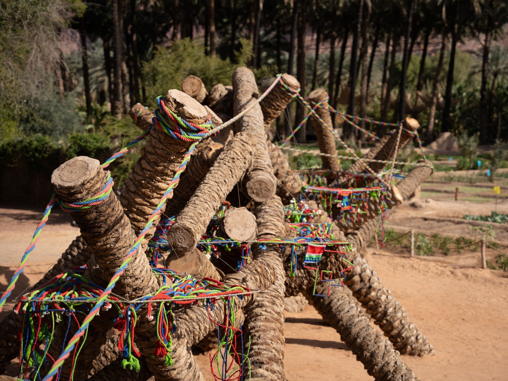 The work that crystallized his language is Palms in Eternal Embrace, winner of the 6th Ithra Art Prize and unveiled during the AlUla Arts Festival in early 2024. The prize grants 100,000 dollars to the winning artist, with additional production support to realize the commission, and acquires the work into the Ithra collection. Obaid Alsafi gathered 33 aged date palm trunks and bound them with braided cords into a skeletal form that reads like a vessel. He sourced some trunks from his own family’s land. “I used 33 palm trees and I know each and every one of their stories,” he says. The result is as intimate as it is monumental.