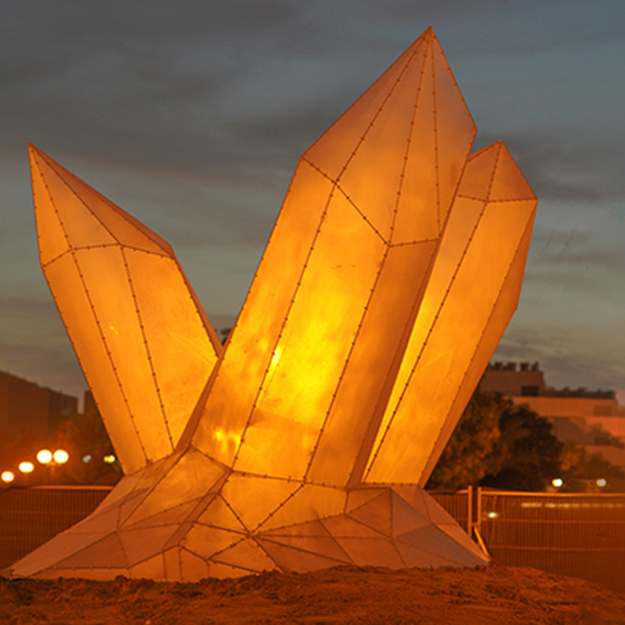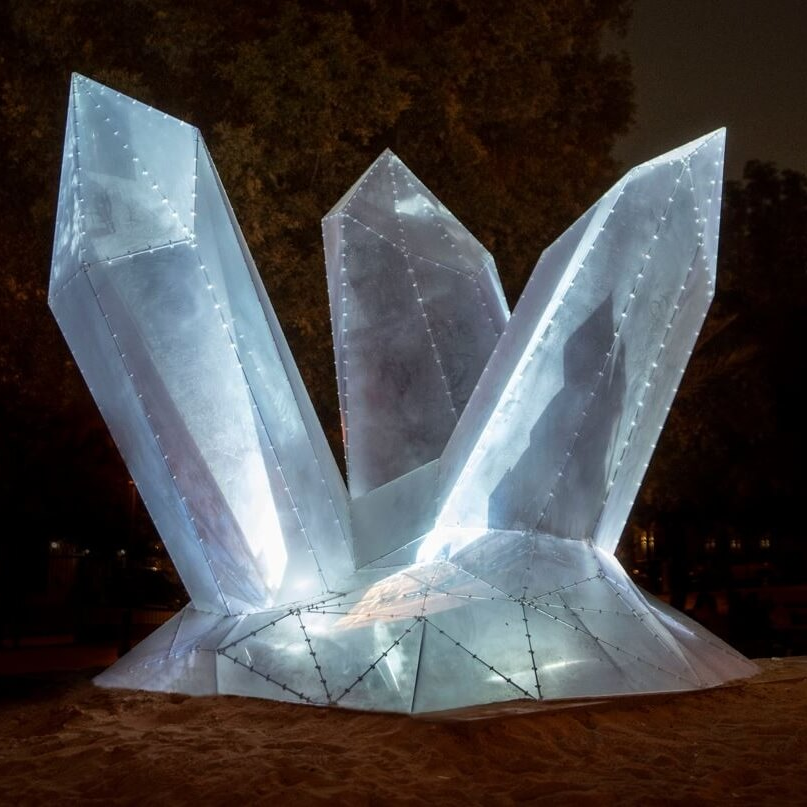 Two years before AlUla, Obaid Alsafi's inquiry into memory and acceleration was already visible at Noor Riyadh, the citywide festival of light. In 2022 he presented Carving the Future, a tall crystalline structure that pulsed with AI-generated imagery shifting between dunes and the city. Placed in the Horimlaa desert outside Riyadh, the work staged a conversation between origin and speed. Festival coverage described it as a meditation on the relationship between the desert and the civilization that emerged from it. The desert became a screen for the metropolis, and the metropolis a mirror for the desert.