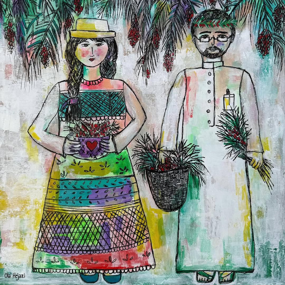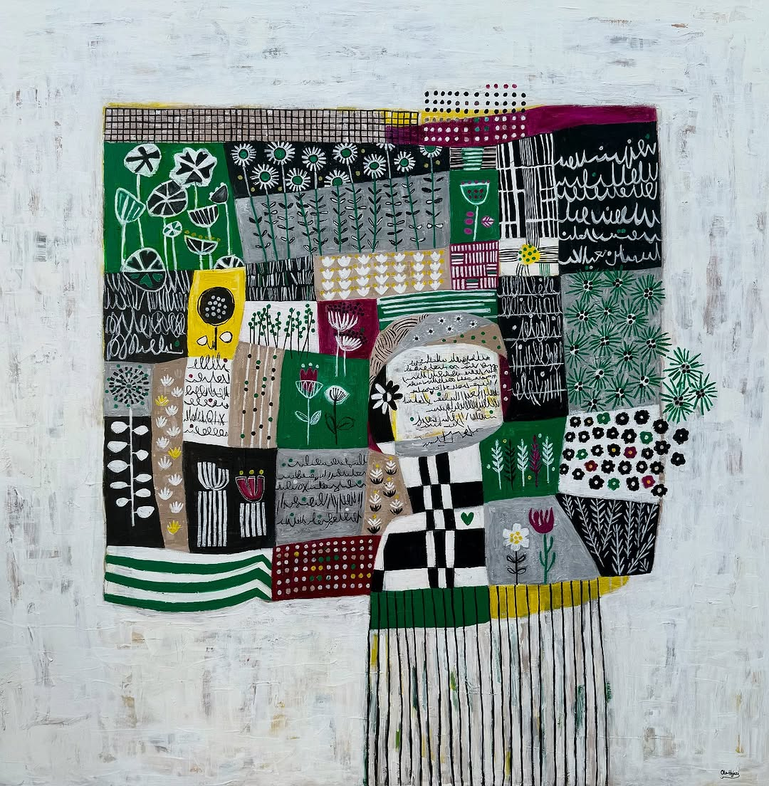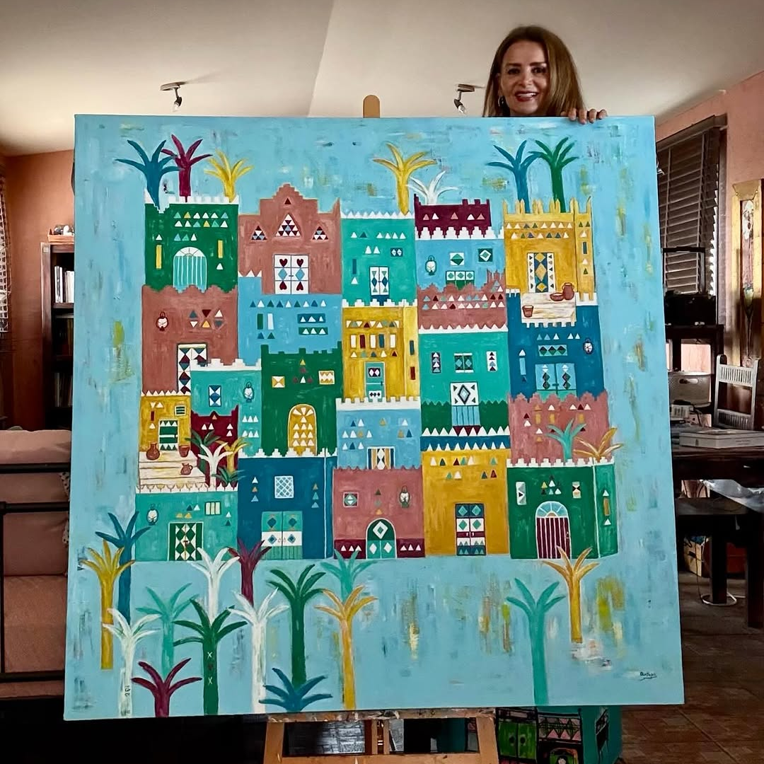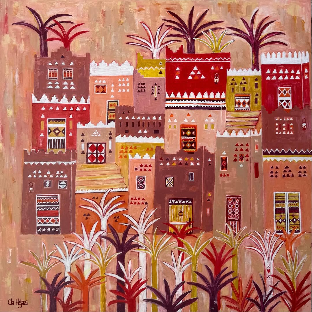 In Hejazi’s work, heritage shows up in symbols and surface language rather than literal storytelling. Traditional architecture appears in stacked forms and patterned facades, while palms, geometric motifs, and folkloric details create a visual rhythm that feels rooted in place. Even when she introduces figures like horses, they read less as subjects and more as cultural emblems, carrying ideas of strength, memory, and belonging. The result is work that feels handcrafted and intimate, like a contemporary patchwork of Saudi visual memory.