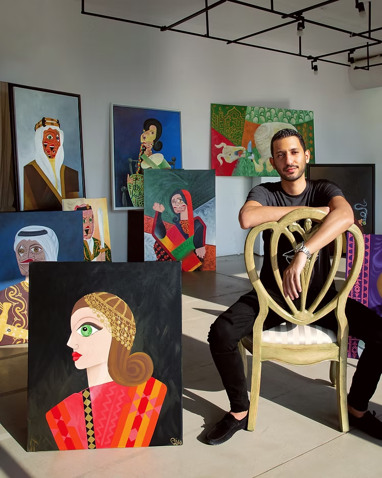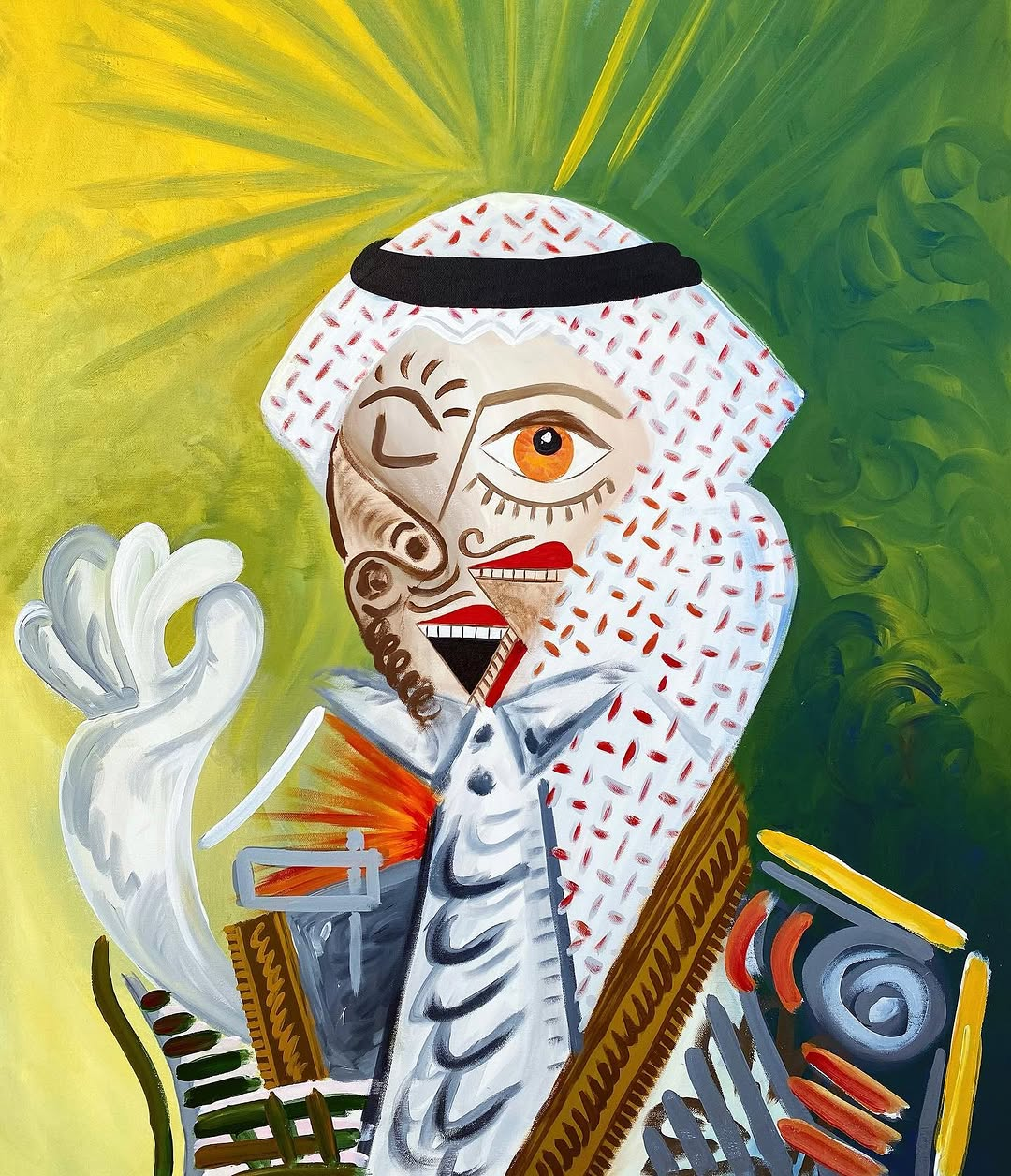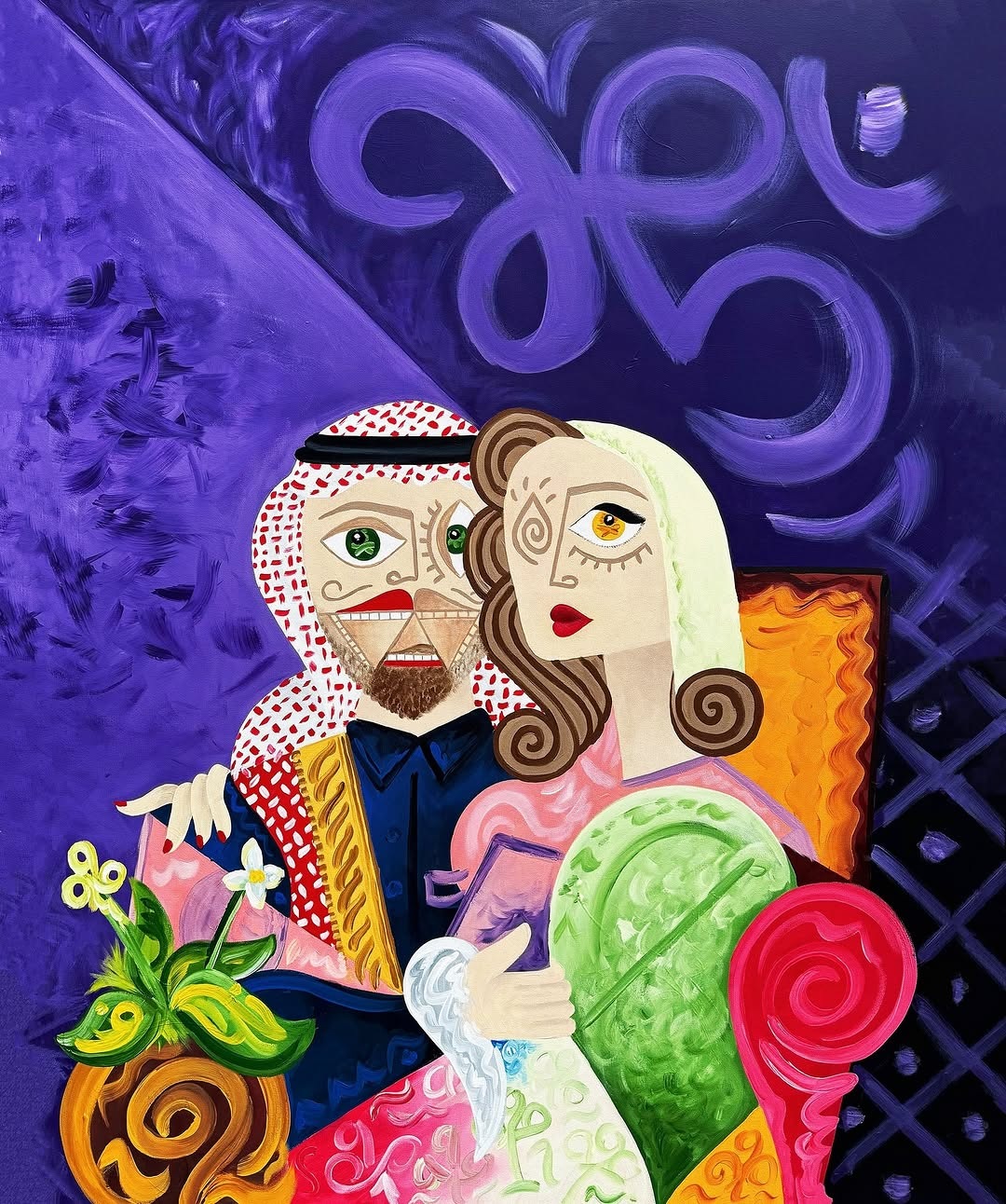 Faisal Alkheriji’s work is often described through cubism, but that label only tells part of the story. His paintings draw on traditional clothing, regional customs, hospitality, tents, gatherings, and collective memory, yet they do so through fractured compositions and abstracted faces that feel contemporary rather than documentary. He has said that cubism felt like the right language for portraying his culture differently. That is what gives his paintings their distinct energy. He is not simply depicting Saudi heritage, but reimagining it through form, color, and rhythm.