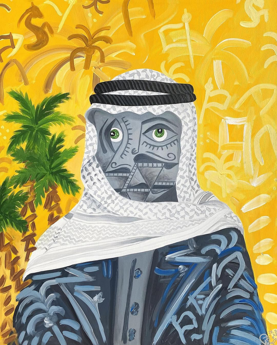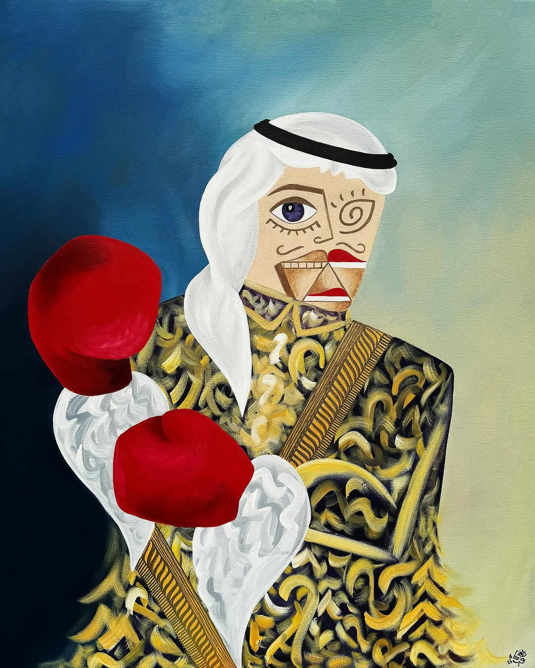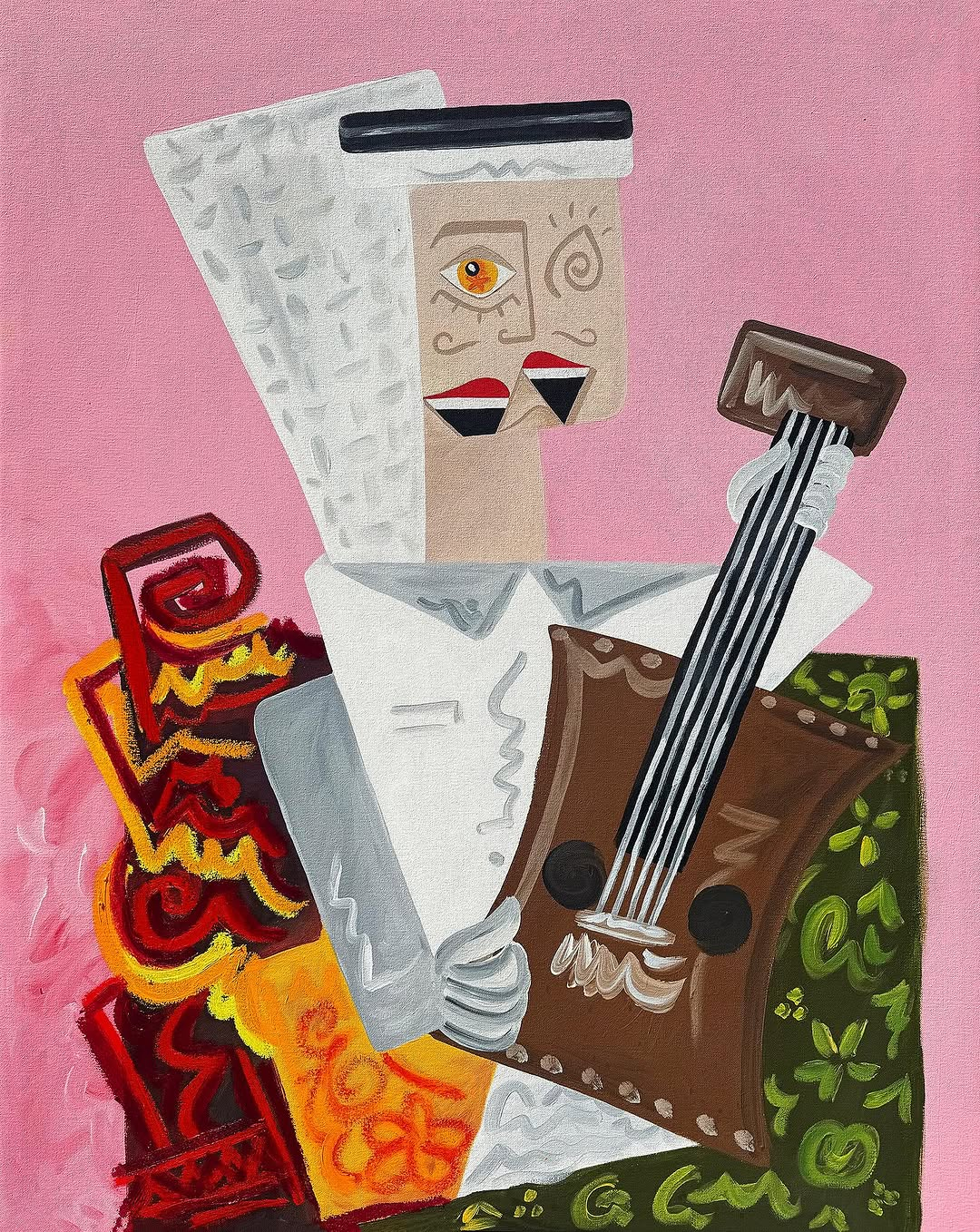 In Men of Saudi Arabia, Alkheriji reinterprets a classic cubist reference through a distinctly Saudi lens. By placing Saudi men within a traditional tent setting and surrounding them with culturally specific details, he transforms an art historical structure into something rooted in local life. The work captures one of his defining strengths: the ability to borrow from global visual language while keeping the emotional and cultural center entirely his own.