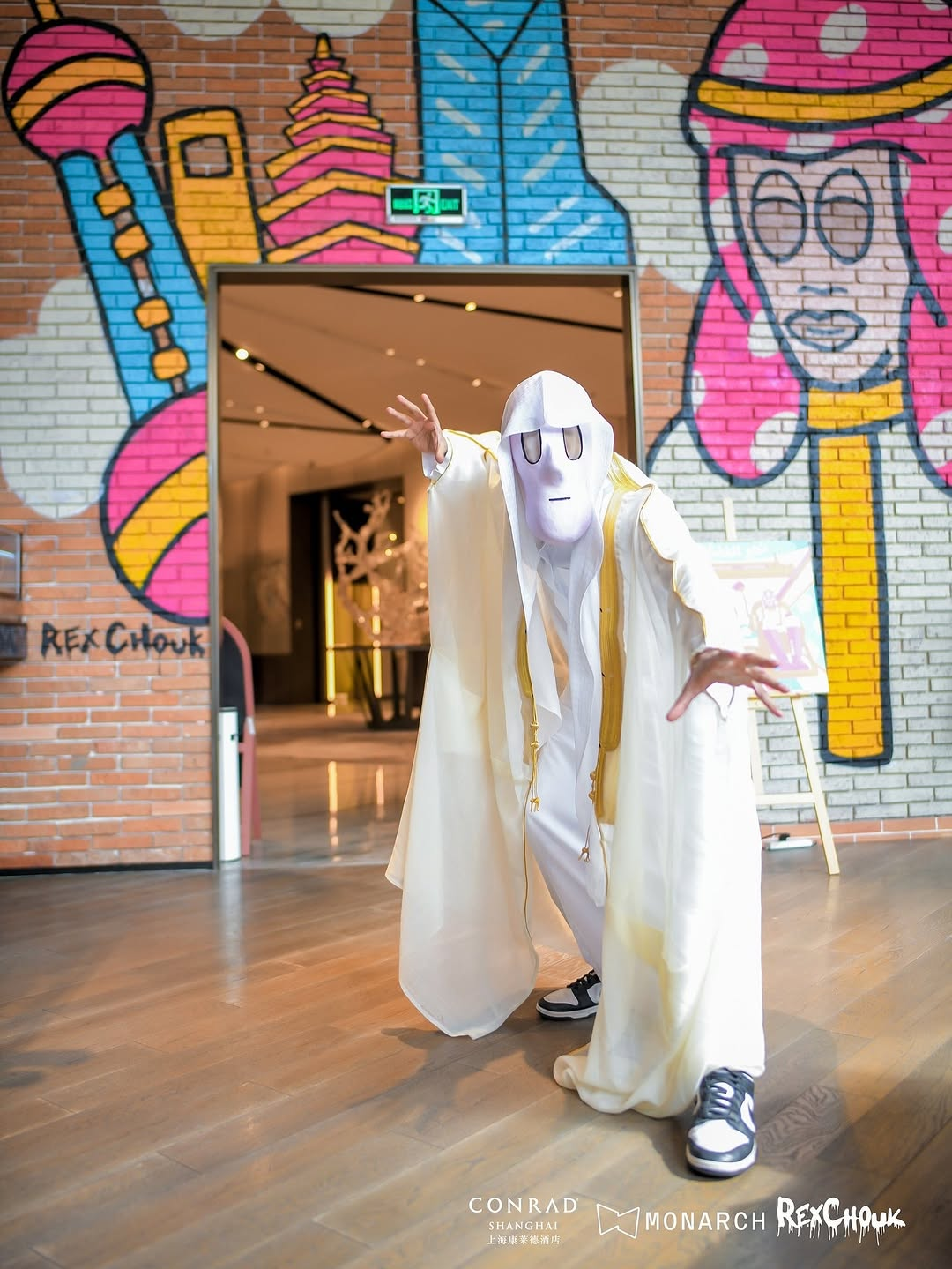Rex wears a mask to pull attention away from his personal biography and toward the world he’s building: a consistent universe of recurring characters, symbols, and bold graphic cues across canvases, prints, murals, and screens. The anonymity creates a useful mystery that lets people project themselves into the work, making it feel communal like street culture, social media, and inside jokes. In this setup, the art isn’t just what he makes; the art is his identity.