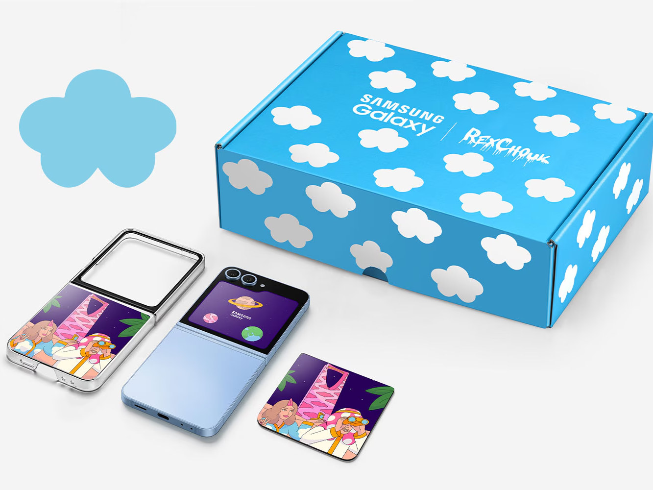 Collaboration is a natural extension of the Rex universe, and his characters travel easily across worlds. With Samsung, he translated his Khaleeji pop into consumer tech through a Flip-branded campaign complete with themed devices and FlipSuit cases. PUMA tapped him for the 2025 Speedcat relaunch in KSA, releasing a limited Chouka vinyl figure tied to in-store purchases at Red Sea Mall, Solitaire Mall, and Nakheel Dammam. For Eyewa, he created a KSA National Day 2024 capsule of totes and stickers that put his illustrations into daily circulation. A long-running creative dialogue with designer Nasiba Hafiz produced a Saudi-made capsule, while community and retail crossovers (from Homegrown Market in Jeddah to pop culture platforms across the Kingdom) keep the work close to its audience.